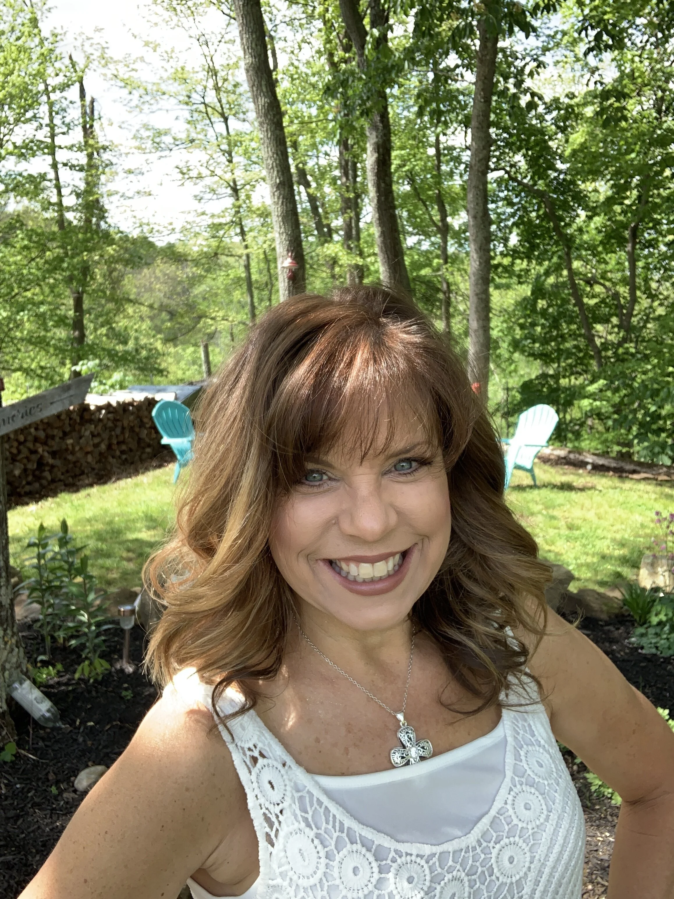 Close up of Traci, smiling wide with teeth showing. She is wearing a white, lacy, tank top with her hands on her hip. Her hair is auburn, and there is a backyard with grass and trees in the background.
